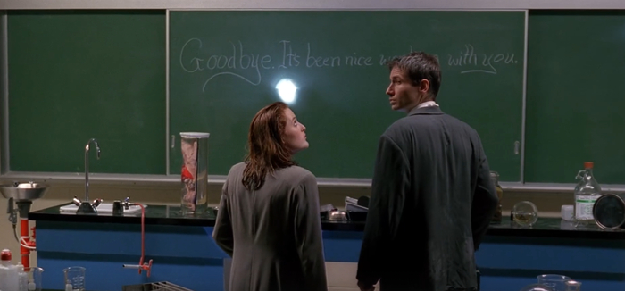 А потом эта сверхестественная сила оставила прощальную надпись для Малдера и Скалли как для коллег: "Goodbye. It's been nice working with you". Что переводится: "Прощайте! Было приятно с вами сотрудничать".