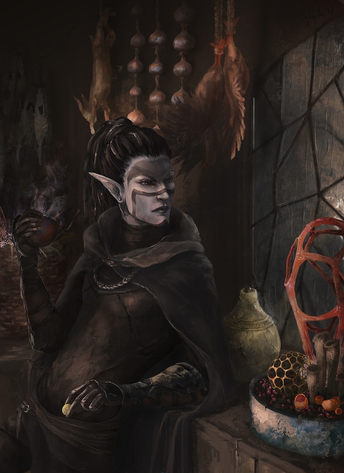 Данмеры вдвоём сели за стол и принялись за вино. Блюда вносили по готовности. Через какие-то полчаса на столе чего только не было: мамонтовое барбекю «по скайримски», отбивные из солстхеймского хоркера, икра дикой рыбы-убийцы, устрицы из Чернотопья, целый тазик с рагу из овощей, выращенных в Киродииле! Ещё через какое-то время появился небольшой оркестр, играющий бессмертные мелодии Жеремина Соули.