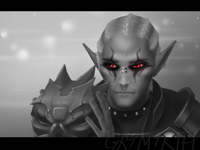 А это мой второй данмер, который хитро прячет морагтонговскую татуировку под шлемом.