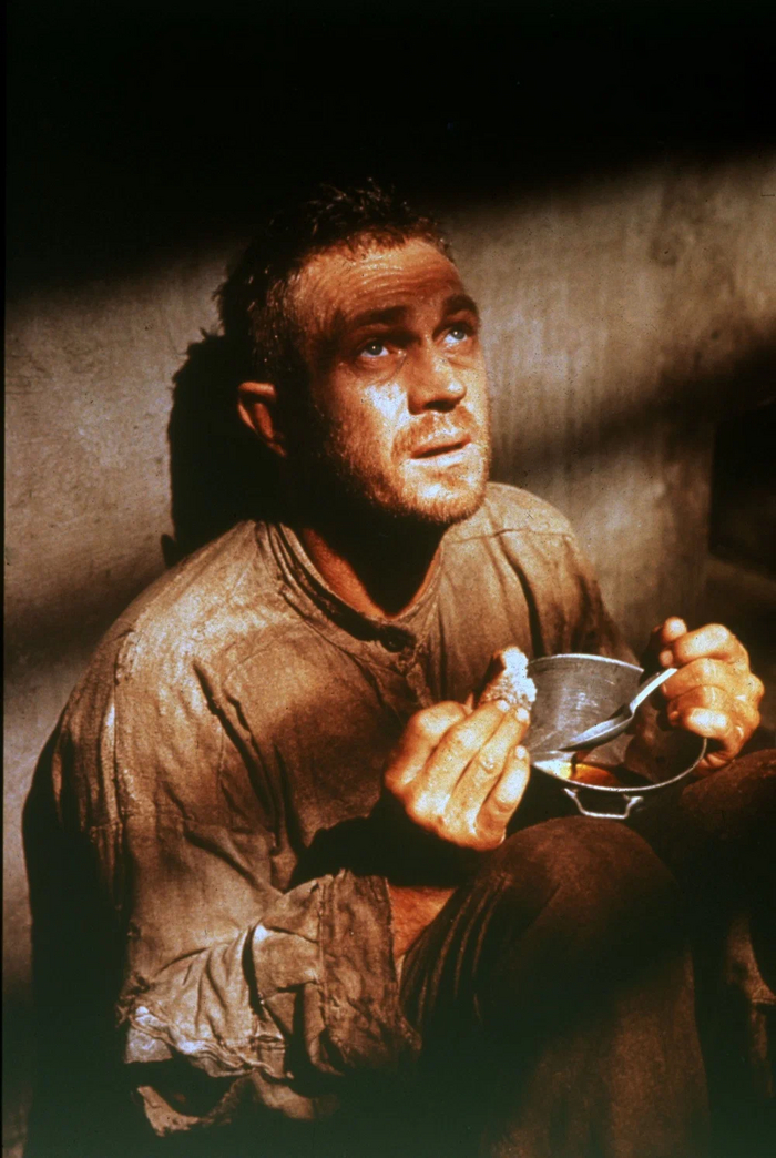 Главную роль исполнил Стив МакКуин, его нельзя назвать уж слишком популярным актёром, но тем не менее несколько ярких ролей за свою не очень длинную актёрскую карьеру он исполнил, что примечательно многие из этих ролей как-то связаны со свободой, в одних он пытается её обрести/удержать, как в фильмах "Побег" и "Большой побег", а в других наоборот отбирает (Небезосновательно, конечно)("Великолепная семерка", "Охотник"). И, надо сказать, эта роль очень ему к лицу, в его глазах видна эта навязчивая граничащая с безумием мечта, мечта о свободе, о жизни, которую он заслуживает и по ходу фильма эта мысль не только не угасает, но разрастается всё большим безумием под гнётом всех лишений и трудностей, которые он пережил. Невольно задумываешься, насколько нужна этому человеку свобода и стоит ли она этого безумия, да есть ли у него в данной ситуации выбор вообще...
