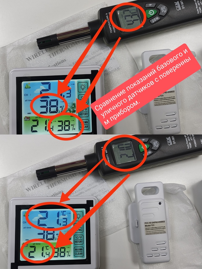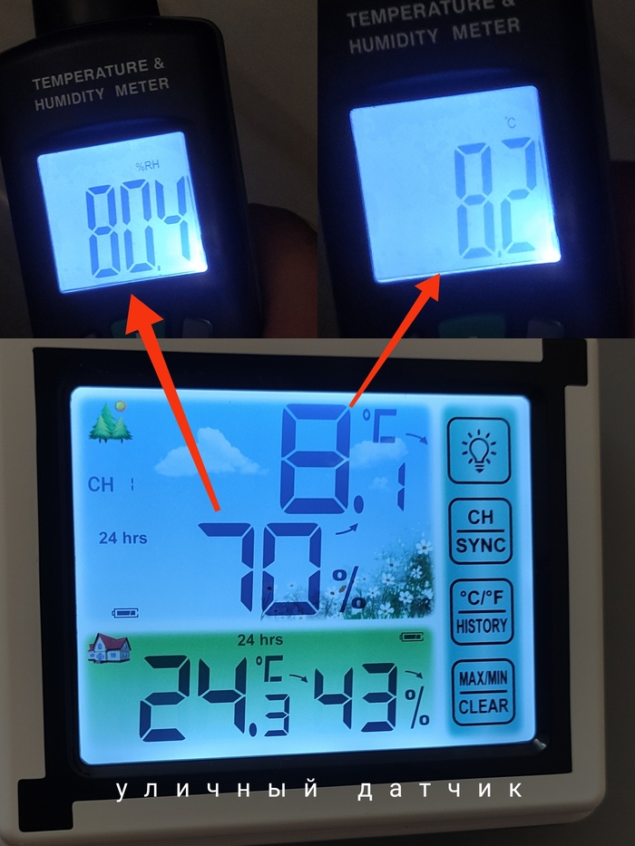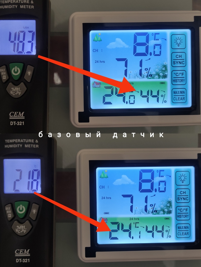 При повышении влажности разброс увеличивается, но всё ещё остаётся в рамках разумного. По фото к температуре в базовой станции есть вопросы, но дальше я поясню расхождения.
