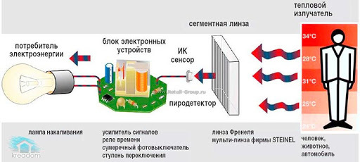 К картинке ниже, тут указана лампа накаливания, которая включается по срабатыванию датчика движения, а выше, как я подразумеваю, охранный датчик движения)