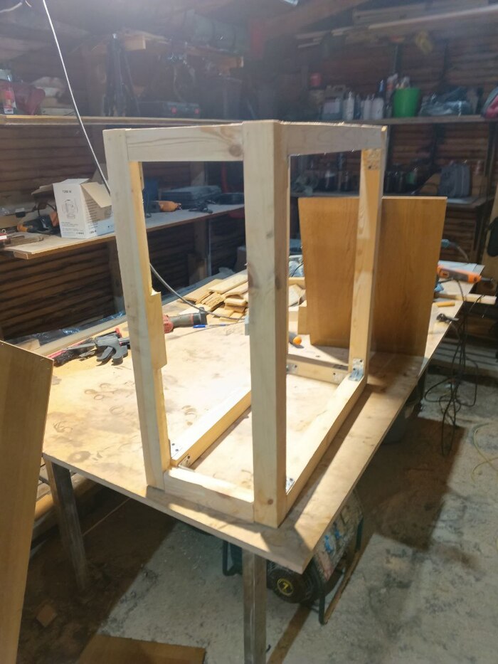 Сделал каркас, утеплил со всех сторон пенопластом 50 мм. Стены — остатки вагонки снаружи, внутри двп от старого шкафа под дерево, и задняя акцентная стена из белого двп. Вставил два стеклопакета (по работе заказываю, поэтому сделали дешево - 250х250х32 каждый). Крыша пока — просто фанера, так же с пенопластом внутри. хотел гибкую черепицу, но уже пришли морозы, поэтому оставил на весну, потому что гараж холодный и неудобно с ней работать