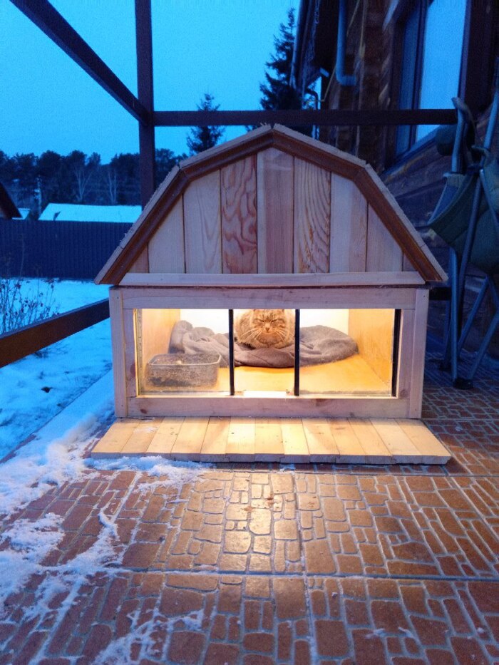 Внутрь поставил лампу на 60 Вт (подключил к гаражной розетке). После того как увидел, что они заходят и им норм, добавил тройную шторку из джутового утеплителя. Хотел модную шторку поставить с ВБ специальную, но как говорится - нет ничего постояннее, чем временное.