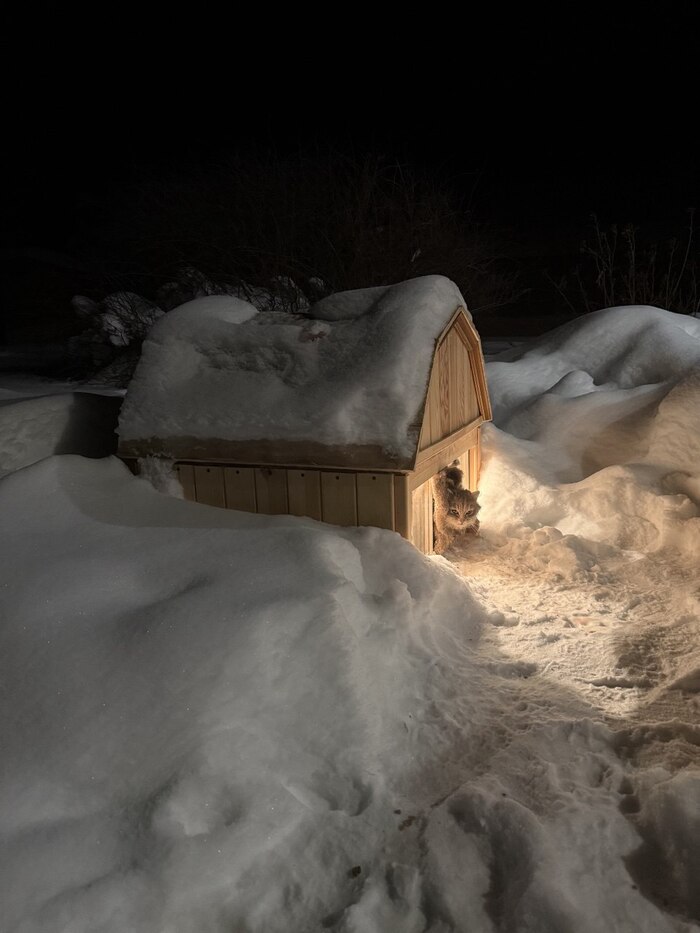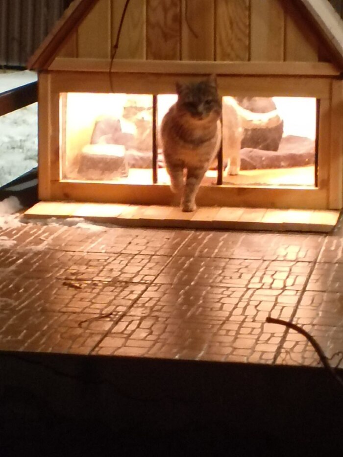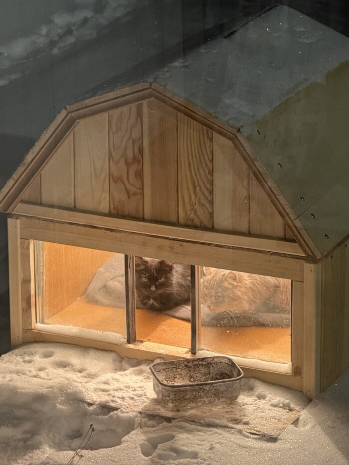 Теперь в «кото-хате» живут четверо: Дымок, его сестра Мотильда и ещё две неизвестные кошки. Все дикие, пугливые, но тёплое место оценили.