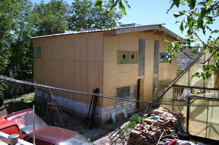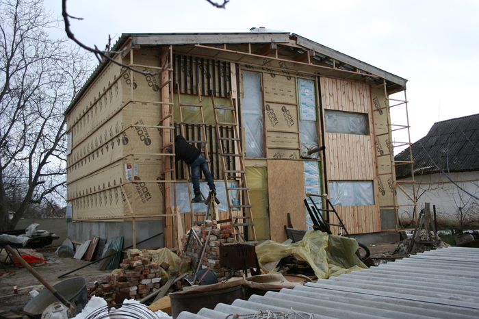 Весь каркас дома возводил с отцом и тестем, и на это ушло 6 дней, что как по мне довольно быстро. Но все строительство растянулось аж на 3,5 года. Альтернативой каркаснику рассматривали стены из газобетона, но по расчетам они выходили на четверть дороже и на треть холоднее. В проекте дома пытался реализовать по максимуму интересных решений, но при этом чтобы все было практично и рационально. На весь дом не считая участка потрачено около 20000$. Такой ценник был до переезда, обустройство дома продолжается так что это не итоговая цена.