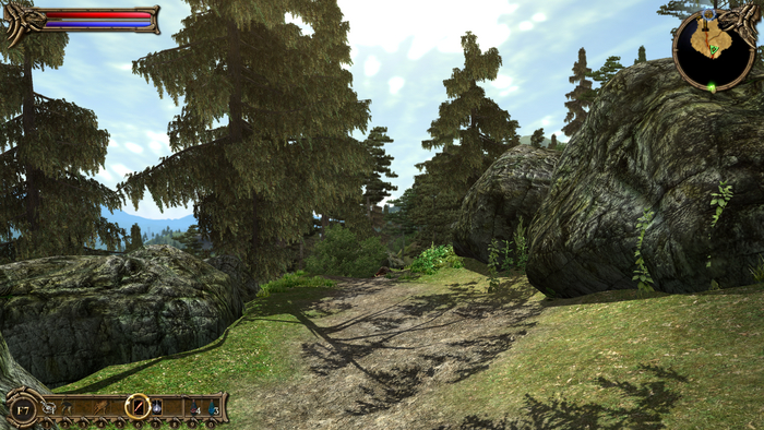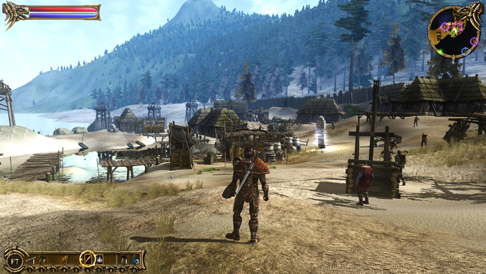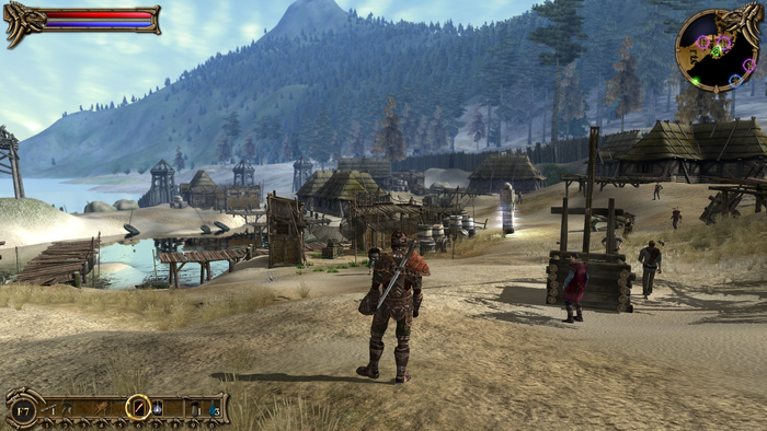 Reality Pump Studios несколько доработали свой движок Earth-4 (который использовался в Earth 2160), поддерживающий различные графические технологии, типа текстур высокого разрешения, удаленный рельеф местности, шейдерную воду с отражениями, вырвиглазное HDR освещение, динамические тени и т.д. И нужно признать, в год 2007-ом году Two Worlds действительно могла порадовать глаз своими пейзажами и графикой в целом. Конечно Reality Pump пришлось использовать некоторые хитрости, типа жесткого LOD всего вокруг и внедрения DOF ("размыливание" удаленных ландшафтов как в Gothic 3) для оптимизации, но это ничего :)