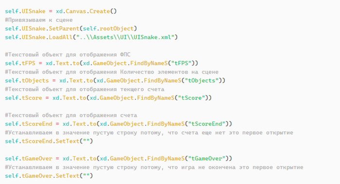 Далее добавляем на сцену окно из файла UISnake.xml для отображения текущих игровых данных а запоминаем ссылки на элементы интерфейса см которыми после будем работать