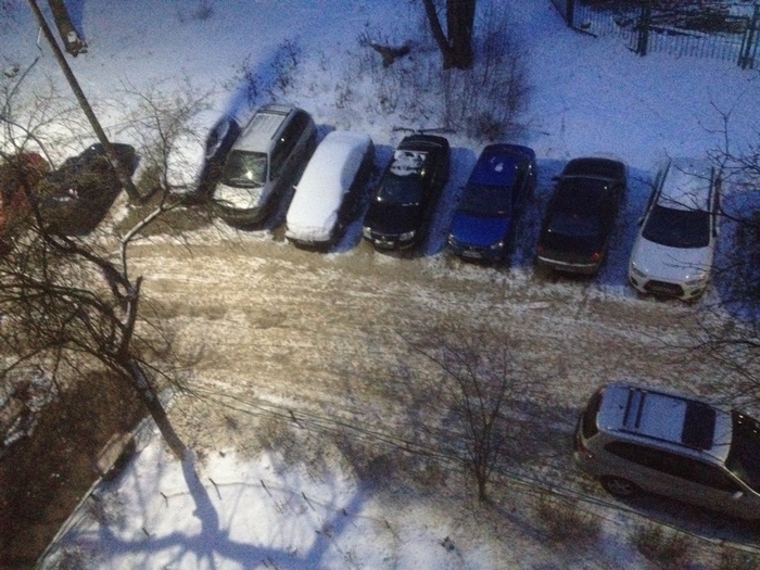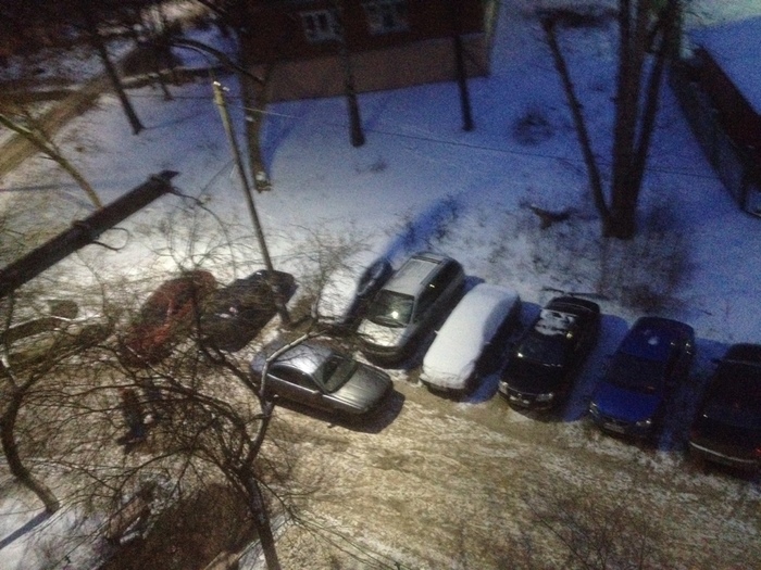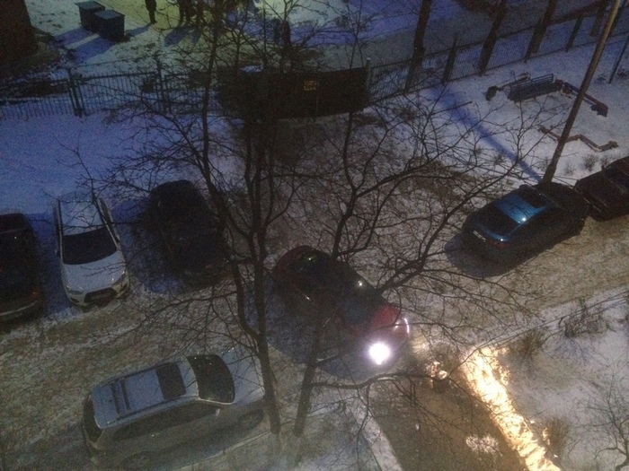 Красная машинка - только что забрали ребенка. Пытается развернутся и уехать. Спасибо бревнышку, не в подъезд.