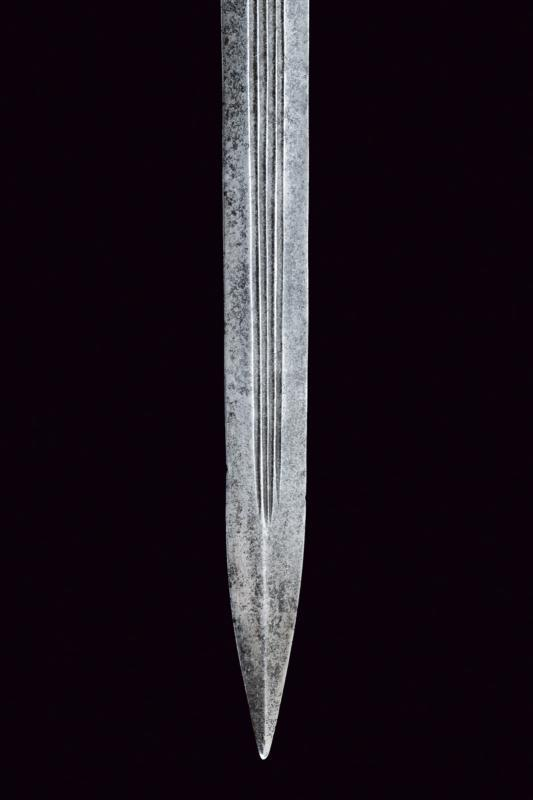 Клинок с четырьмя канавками, идущими почти до самого острия, толстый хвостовик имеет два дополнительных дола по бокам. На передней части клинка находится старинное клеймо, напоминающее лилию (с одной стороны клеймо сохранилось лучше, с другой оно менее заметно, но с небольшими остатками медного покрытия).