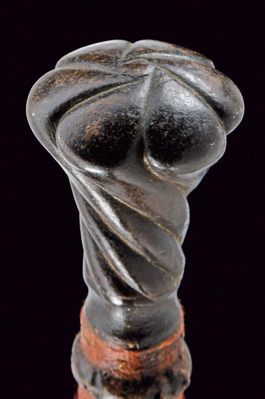 Навершие пропорциональное и выполнено в едином стиле с концами рукоятей. Очень длинная деревянная рукоять, в наше время обтянутая красной тканью; остатки оригинальной кожи все еще видны у основания, а также в нескольких небольших пятнах под красной отделкой.