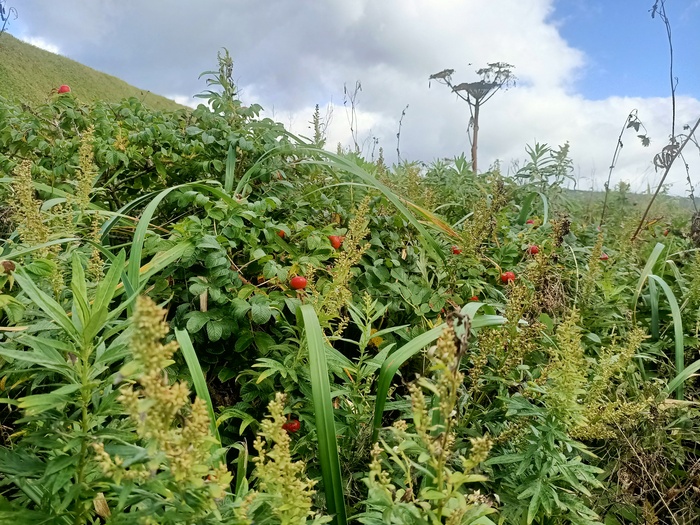 Никогда не видел таких больших шиповников, размером почти с яблоко. Этот шиповник по всему побережью нас провожал до конца маршрута. Голодным на Кунашире не остаться при всем желании.