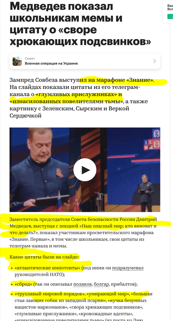 Медведев показал школьникам мемы и цитату о «своре хрюкающих подсвинков»