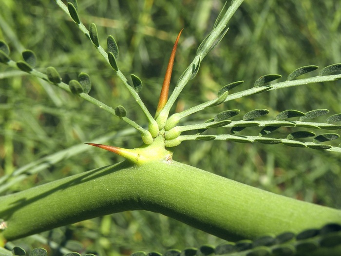 Ветка паркинсонии шиповатой с листьями и шипами. Фото Александра Гибхина с сайта mycoweb.ru. Все растения рода паркинсония имеют общее название – пало верде (исп. palo verde, т.е. зеленая палка). В засуху или в холодное время года растения сбрасывают листья, но фотосинтез продолжается в зеленой коре веток и молодых стволов.