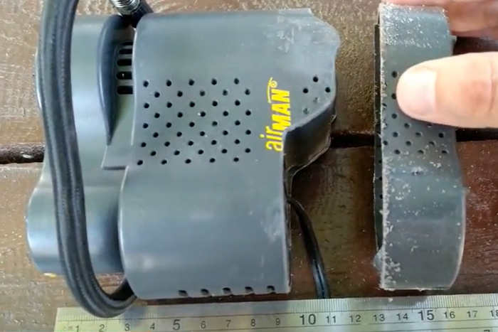 Примерно 1/3 объема занимала бесполезная ниша для укладки длинного провода. Также в компрессоре имелась ниша с крышечкой для хранения аксессуаров - иглы для мяча, переходник на велосипедный ниппель, и прочий хлам, который в мотоциклизме и не нужен. И если хлам можно вытряхнуть, то отсек никуда не денется, и место занимает. Так что некоторые мотоциклисты отпиливали кхуям эту часть корпуса, и размер девайса становился более-менее приемлемый.
