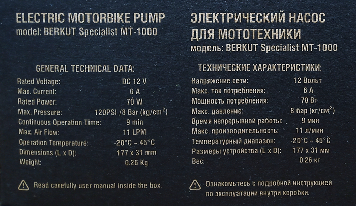 В то же время, инструкция BERKUT запрещает накачивать автомобильные колеса вообще, что попахивает каким-то наебаловом. Ведь по всем параметрам - он это должен сделать быстрее и проще, и легко уложиться в ограничение в 9 минут. Ну да ладно. В машине есть нормальный компрессор, а не этот фаллический символ.