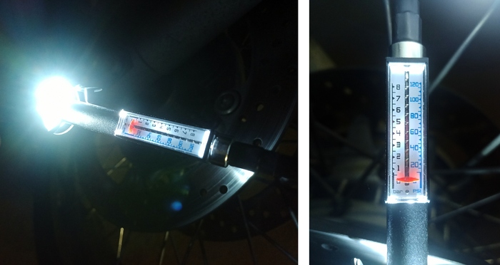 Такое давление абсолютно излишне для мотоцикла, но совершенно нормально для велосипеда. Отсюда и разметка шкалы. Её бы ополовинить и растянуть, чтобы деление было по 0.1 бар. Но не судьба.