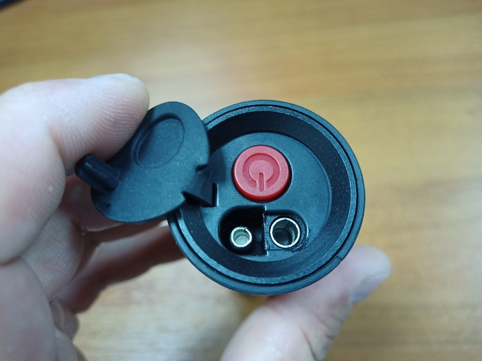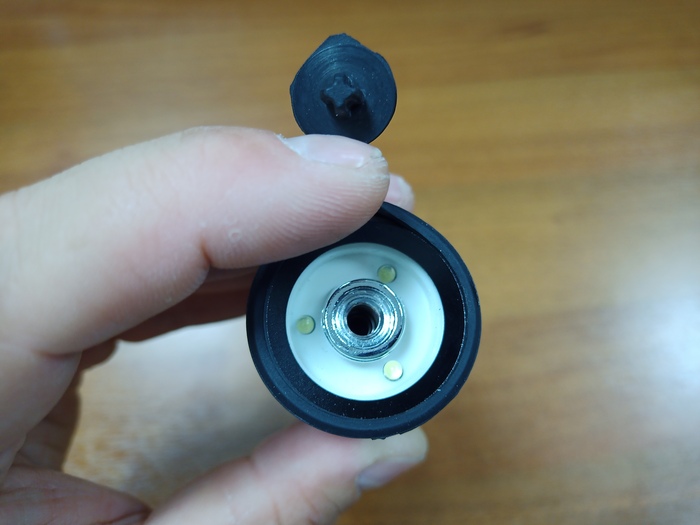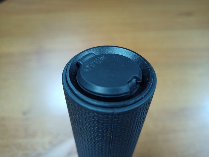 Непосредственно сам корпус выполнен из пластика в виде идеального цилиндра. Сверху и снизу - пластиковые крышки на мелкой резьбе, которые, вероятно, дают доступ к самим кишкам (вскрывать не решился).