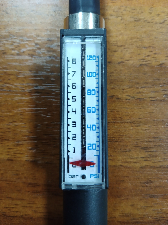 По манометру. Уууу, дааа. У компрессора явно прослеживаются велосипедные корни. Шкала размечена аж до 8 баров, что соответствует заявленной характеристике компрессора.
