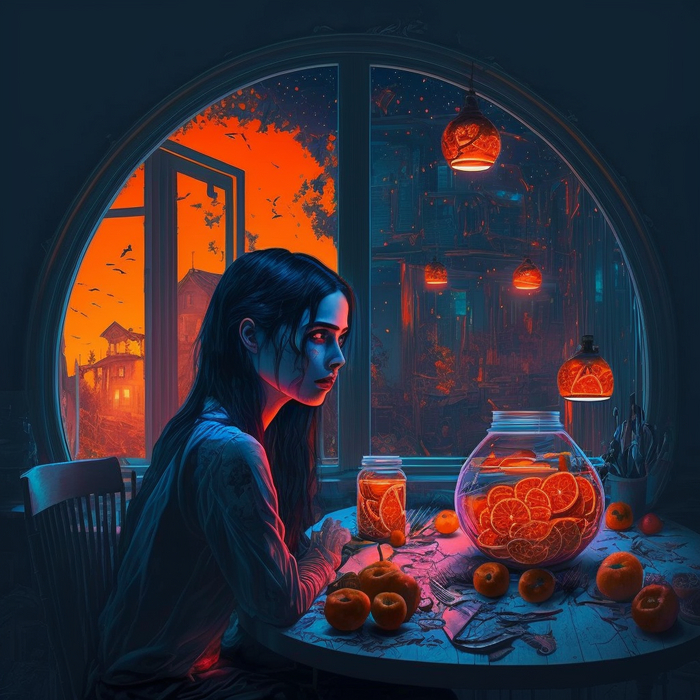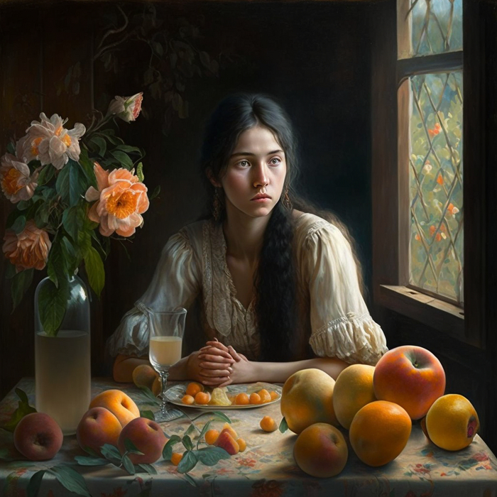 Midjourney Девочка с персиками Длиннопост Арты нейросетей