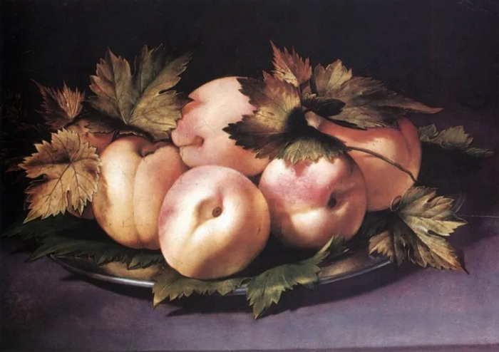 Уже вторая художница в нашем обзоре) Она была первым художником в Италии, написавшим несколько натюрмортов. Ее хрустальная подставка для фруктов с персиками, айвой и цветами жасмина, вероятно, датируется 1607 годом и демонстрирует ее опыт в росписи стекла, а также в захвате различных текстур поверхности фруктов.