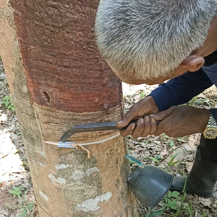 И вот, что я увидел: мужичок ловко надрезает кору дерева, делая ему крово соко-пускание и тут же переходит к следующему. А белый, как молоко, сок начинает течь в чашку.