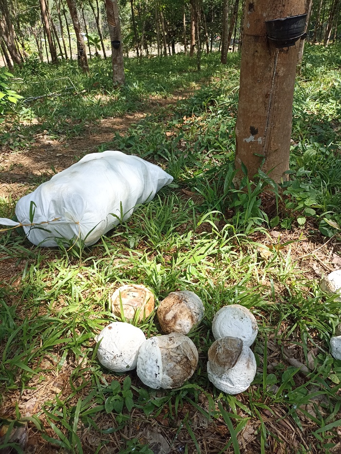 В течение дня чашка наполняется, а сок в ней затвердевает, превращаясь в некое подобие резиновой полусферы. Тот же мужичок извлекает эту полусферу, но не убирает её, а переворачивает, высвобождая пространство в чашке и делает новый надрез на дереве. Ещё через день в чашке лежит уже вот такой мячик.