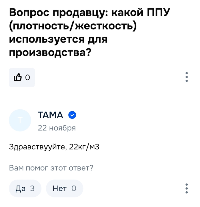 Тут уже продавцы понимают, что они продают товар не совсем дуракам, а как правило ремонтникам мебели и тем, кто эту мебель делает, по этому плотность и все прочие характеристики пены указаны сразу, четко и понятно.