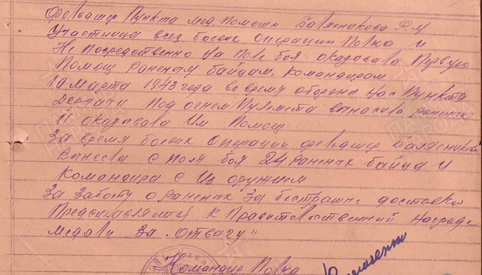 "...Участница всех боевых операций полка, и непосредственно на поле боя оказывала первую помощь раненые бойцам, командиром.