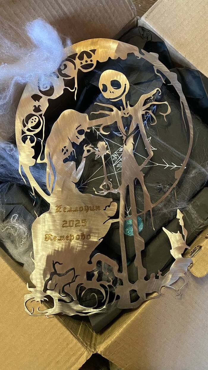 Я обожаю мультфильм «Кошмар перед Рождеством», и мой тайный Дед Мороз — мне прислал шикарную металлическую композицию, которую я уже повесила на стену (подозреваю, что её делали вручную — такая уникальная и атмосферная! Даже если это не так — всё равно впечатляет).