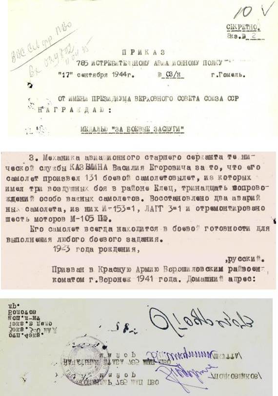 Его сын, Казьмин Василий Егорович. Воевал в Великую Отечественную. Кавалер медали "За боевые заслуги" и ордена "Отечественной войны" 2 ст.
