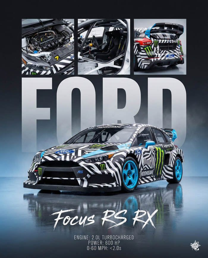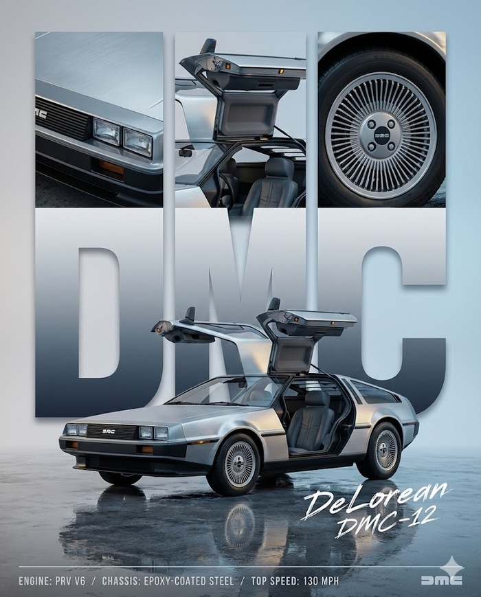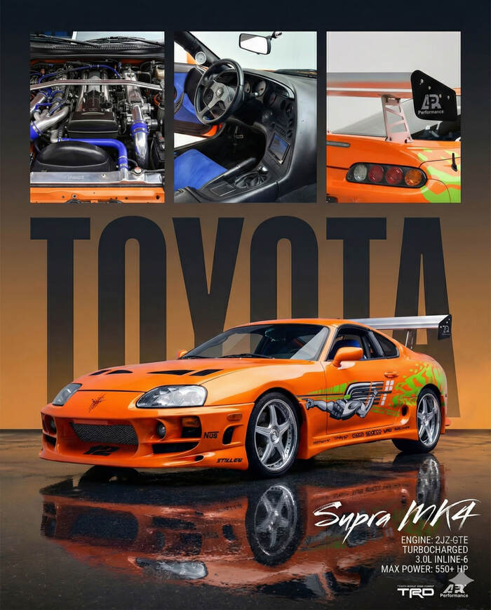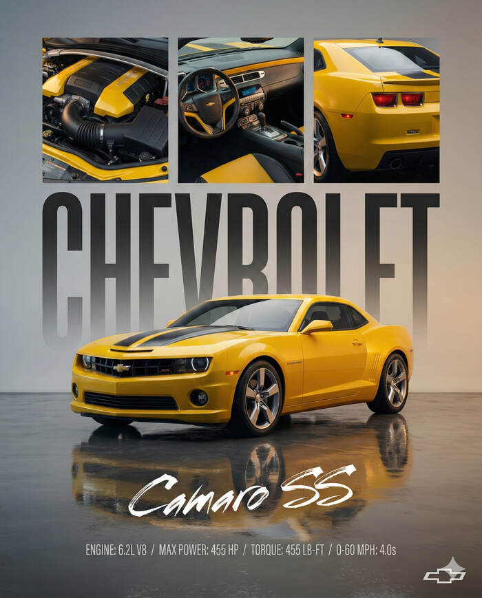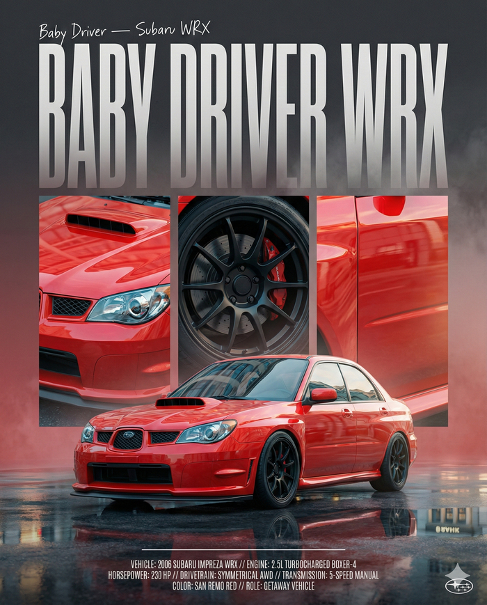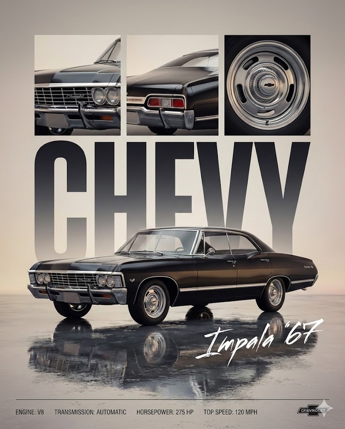 Начали с обычных машин. Берём название модели, цвет — и кидаем в универсальный промпт (он у нас уже был настроен под нужный стиль). Ожидали увидеть что-то среднее между «кривое отражение» и «не тот салон». Но Banana вдруг выдала идеально подобранный интерьер нужной комплектации, правильный двигатель, ракурс, характеристики — и всё это в красивом постере с мокрым полом, светом и огромной типографикой. Мы меняли только марку и цвет. Остальное она собирала сама.