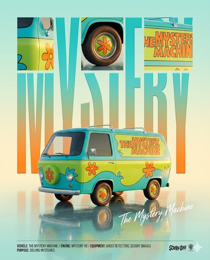 Разогревшись, решили усложнить эксперимент, чуток адаптировали промпт и погнали делать киномашины. Бэтмобиль, Делореан, Импала из «Сверхъестественного», фургончик Скуби-Ду, машина из «Малыша на драйве» — и снова получилось так, будто мы готовим рекламу к кинопремьере. Получилось удивительно атмосферно — будто Banana схватила визуальный стиль фильма без дополнительных подсказок.