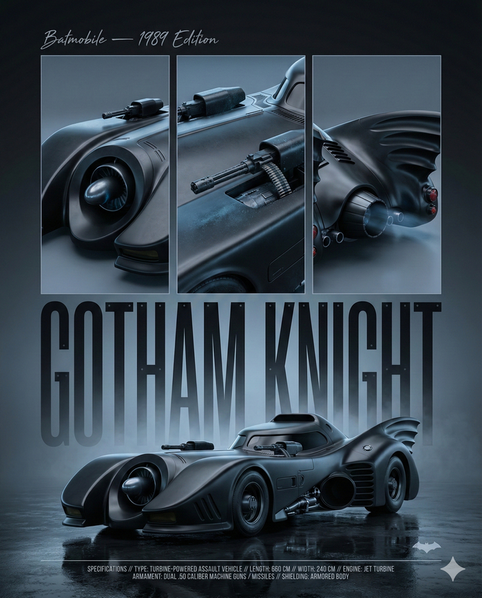 Без странностей тоже не обошлось: в одной генерации вместо «Gotham Knight» появился «Botham Knight» 😂, а где-то текст лег прямо на кузов. Но это примерно 1 раз из 30 попыток. Зато когда кончается квота в Gemini и сервис переходит на бесплатную версию Banana — всё сразу становится криво: интерьер случайный, текст пляшет, постер рассыпается. Контраст огромный.