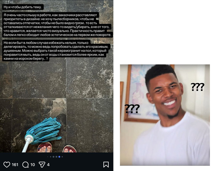 Тема давно не даёт мне покоя, особенно когда на цифровых пространствах встречаются посты дизайнеров, которые искренне возмущаются, если заказчик не хочет интерьер, полный пылесборников и поверхностей, на которых видны отпечатки. При этом замечания о том, что требования к чистоте имеют не последнее значение, вызывают у таких специалистов полное недоумение и, очевидно, оскорбляют их эстетическое самосознание.