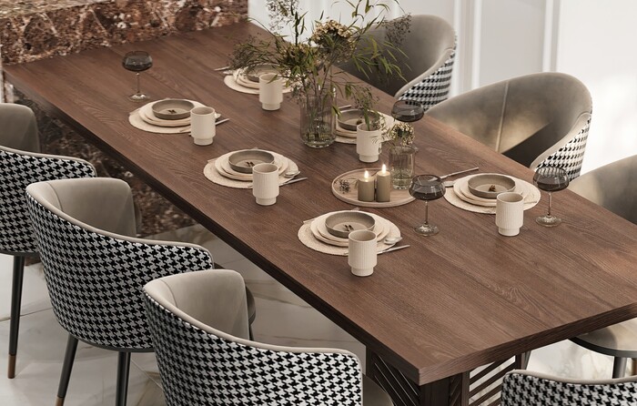 Это один из символов русского интерьера. Подойдёт прямоугольный стол из массива или столешница из шпона с толстой кромкой. Такой стол создает центр композиции, именно вокруг него будет собираться семья и гости.