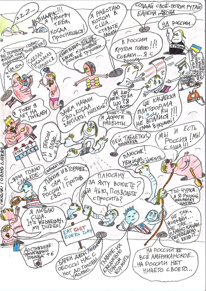 Полезные идиоты (обычные пользователи) подхватывают за стаей и начинают подтявкивать в такт. Их нельзя винить. Не каждый способен думать критически, особенно, если тебя за шутку про Россию "хвалят" плюсиками, смайликами. Дрессируется собачка из такого полезного и бесплатного идиота Щеночек начинает ощущать, что стае нравится такая модель поведения. Поругай Россию или похвали сша (связка) - это плюсики. Похвали Россию или поругай барена - это плохо. Айяйяй. Таким немудрёным способом послушная собачка формируется и дрессируется. Через год эта собачка (кстати, с паспортом РФ) будет рвать в интернете любого, кто думает, что Россия - это хорошо, а сша - это плохо. Вот, бесплатный идиот и готов. То есть, задачей организованной группы является не только ежедневное создание связок, но и создание армии бесплатных идиотов. И ржут, и ржут эти гадины над своей страной, хвостами виляют. Им ссут в морды их собачьи, а они ржут. Им ведро мочи льют на башку, а они бегут кино американское смотреть. И не дай Бог им сказать об этом, сразу начнёт визжать бродячья стая: "Интернет тоже американский - отключай, таблетки выпей". Армия России у них - говно, музыка - говно, науки нет, всё воруют, дороги разрушены, дети политиков за рубежом, всё разворовано...но Илон Маск из сша запустил звезду смерти, в сша у среднего класса свой домик с садом и бассейном, Голливуд выпустил новинку... Бесплатно пьют мочу граждане России, которых организованная группа лиц очень аккуратно привела к такому осознанию реальности.
