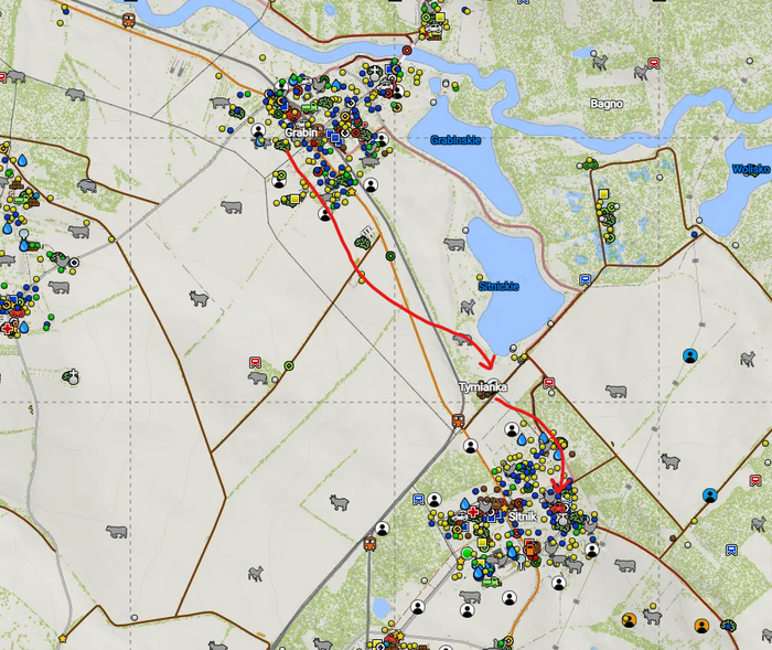 Появился я в городе Grabin на северо-востоке карты. Сразу отправился в маленький охотничий лагерь, нашёл там поврежденный арбалет, скрафтил из палок 3 болта, а оттуда заглянул в город Sitnik.