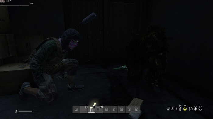 Очнулся я с завязанными скотчем руками и сломанной от выстрела ногой. Надо мной стоит чувак и говорит, скажи, что-нибудь по-китайски и злобно смеется в ночи. А выглядел он как куст (в маскировочном костюме) с жуткой маской клоуна. Ну, думаю, приехали, сейчас издеваться будет. Потом говорит, развязывайся и ползи в дом, сиди тихо, тут опасно. Ну что делать, пополз, нога сломана. Забрался в домик, забился в угол, здоровья мало, еда кончается, нога сломана, тело от холода трясет. Сижу в темноте, с арбалетом нацеленным на дверь, то и дело вспышки от выстрелов в ночи за окном.