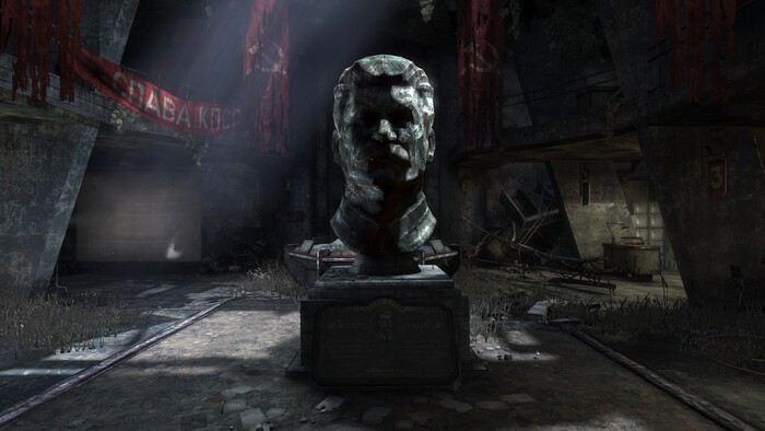 Этот шутер делали американцы, поэтому реализм окружения пострадал. Мы видим здесь типичную американскую архитектуру с навешанными повсюду красными знамёнами и статуями Сталина, а сверху всё это сдобрено клюквой. При этом подаётся всё с максимально серьёзной подачей. От этого, если честно, ещё смешнее.