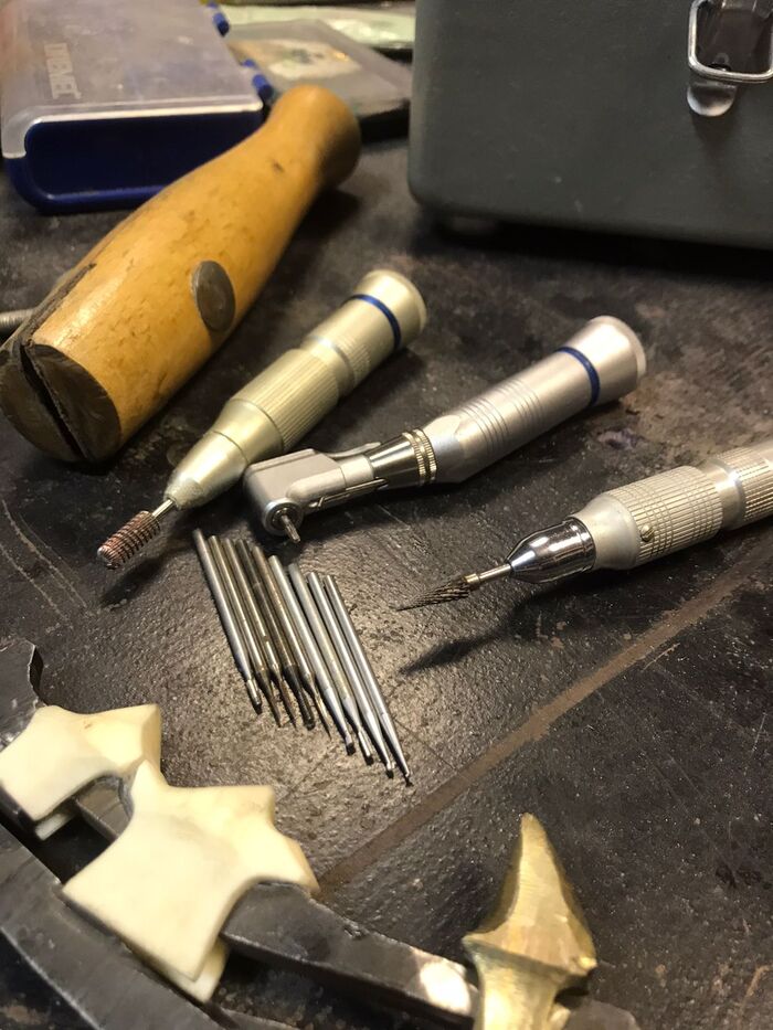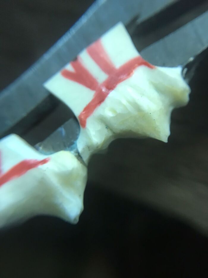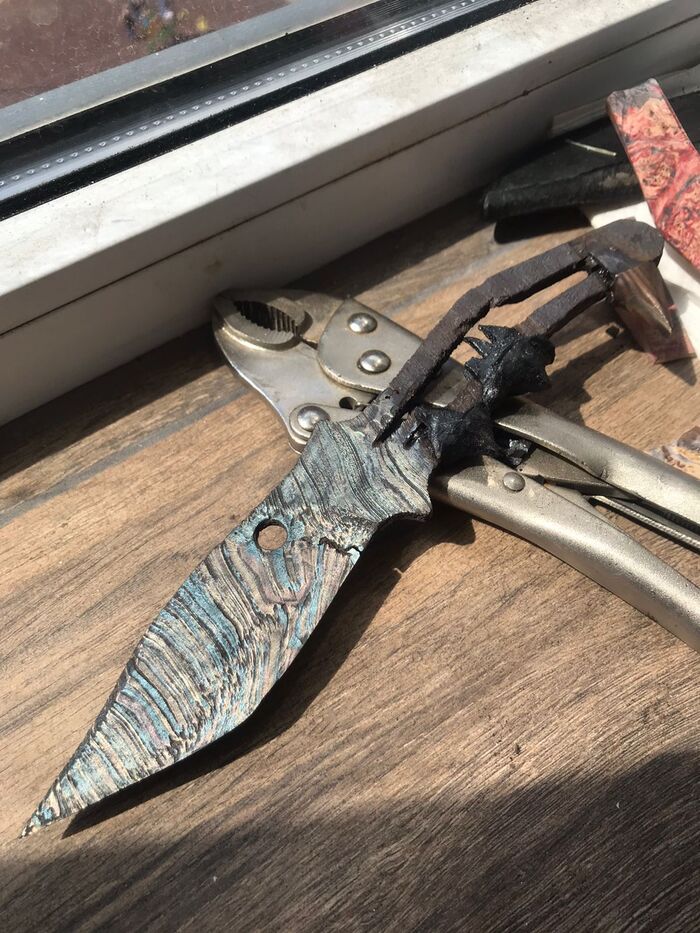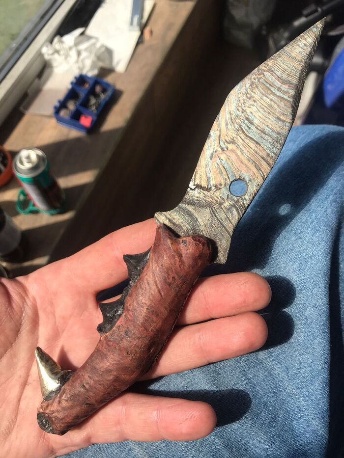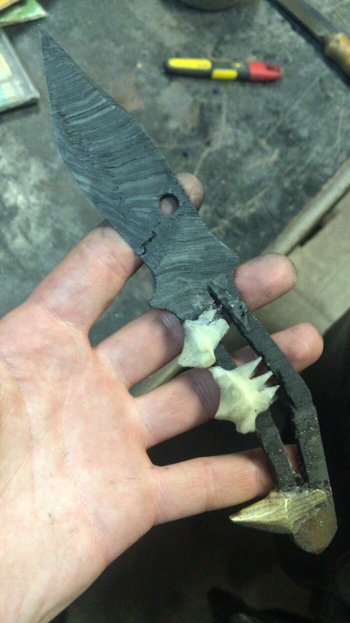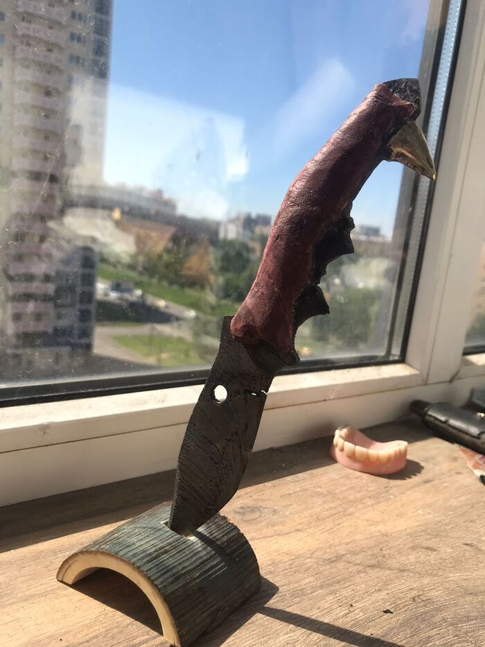Ну не нравится мне идеально белый цвет зубов. Поэтому я их кремировал при 285 градусах. Зубки почернели, но прочность не потеряли. Теперь это более необычно. Фотографировал на пирожок с капустой, надеюсь, будущий владелец сделает это качественно. Все-таки, мы историю творим, а не просто точим. Металл приобрел характерные для инопланетного цвета и Ааргх будет доволен.