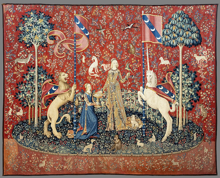 Думаете, тема средневековья и единорогов не раскрыта? Ну тогда вот еще несколько гобеленов из той же эпохи, только из цикла «Дама с единорогом». Они уже украшают стены спальни Гриффиндора. Ну и снова я вижу, как рассуждали художники: нужно что-то старинное, волшебное и красное. Хмм…