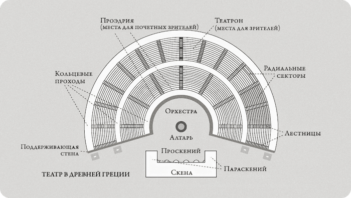 Центральным местом театра была орхестра — круглая площадка для выступлений артистов.