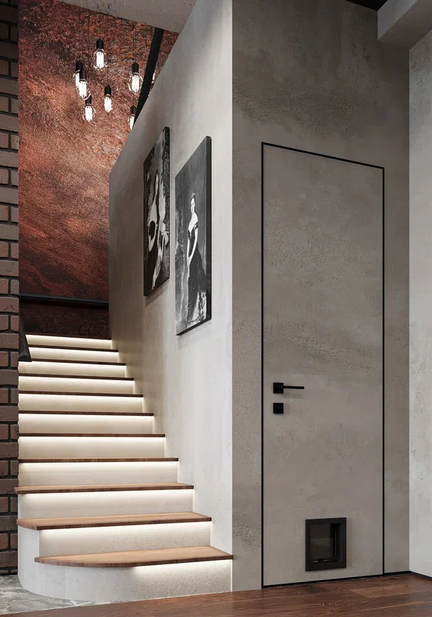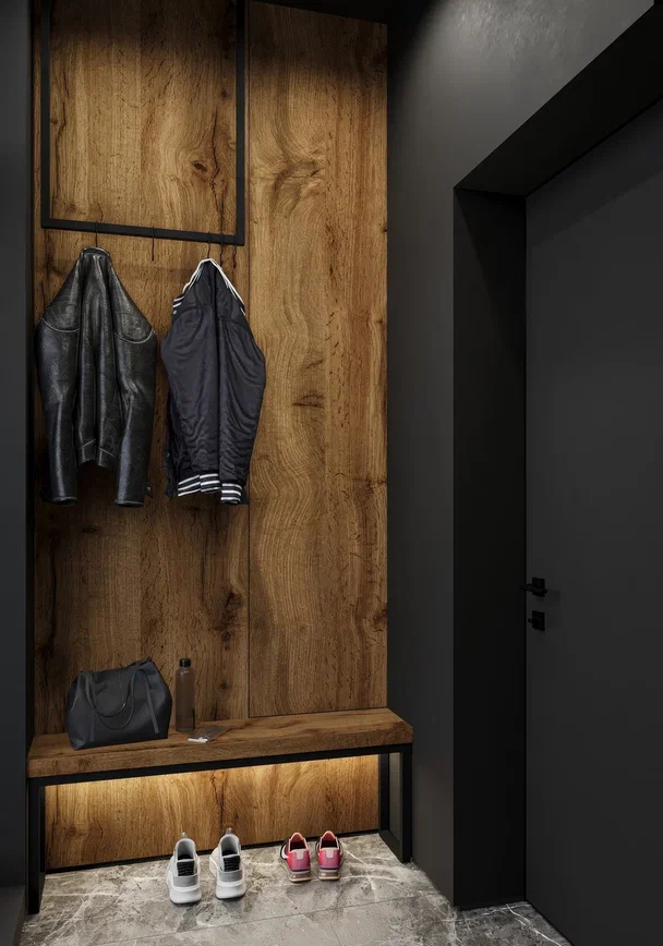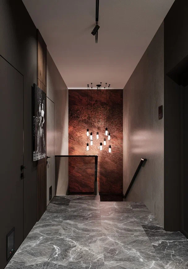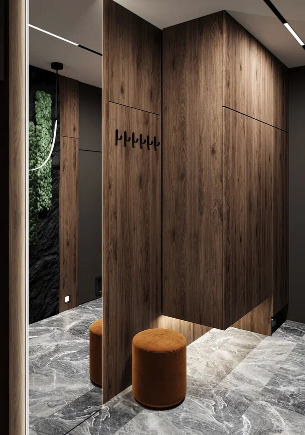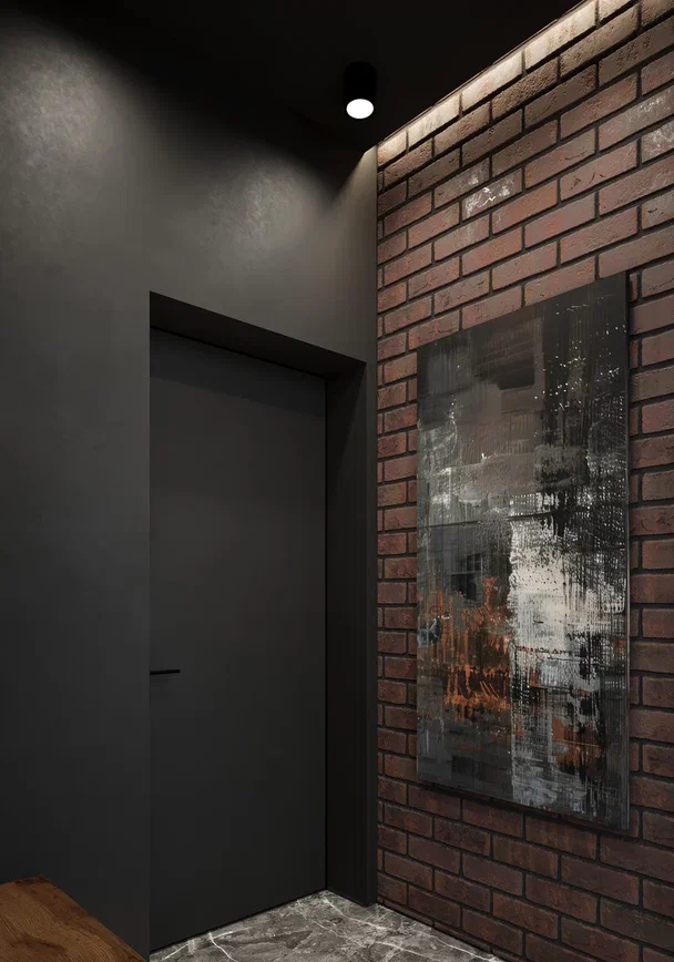 Прихожая оформлена в тёплых тёмных оттенках с акцентами из дерева и декоративного кирпича. Встроенные шкафы обеспечивают удобное хранение, а мягкая подсветка подчеркивает текстуры материалов. Лестница с акцентной стеной и каскадом светильников добавляет глубины и визуального интереса пространству.