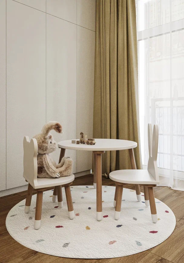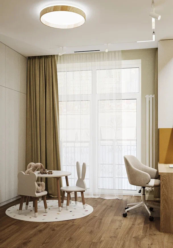Игровая часть оформлена мебелью с «звериными» деталями и круглым ковром. Светлые шторы и большие окна наполняют комнату естественным светом. Интерьер сочетает функциональность и лёгкость, сохраняя при этом современный характер.