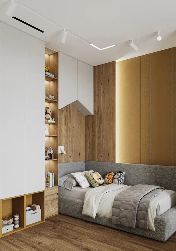 В проекте особое внимание уделено освещению: подвесные светильники задают настроение, а встроенные линии и точечные источники создают равномерный мягкий свет, комфортный для ребёнка.