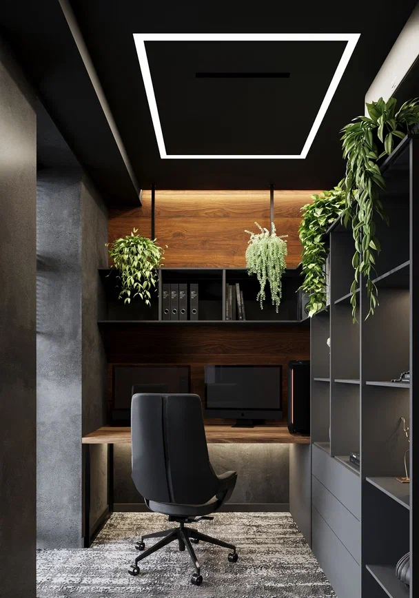 Кабинет стал отдельным пространством для концентрации и уединения. Рабочая зона оформлена в спокойных серо-коричневых тонах с деревянной столешницей и минималистичным декором.