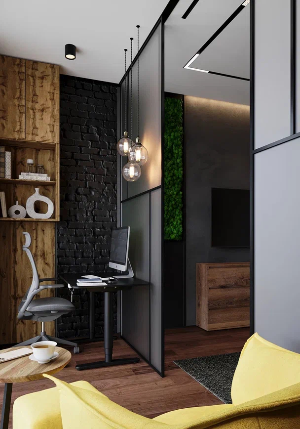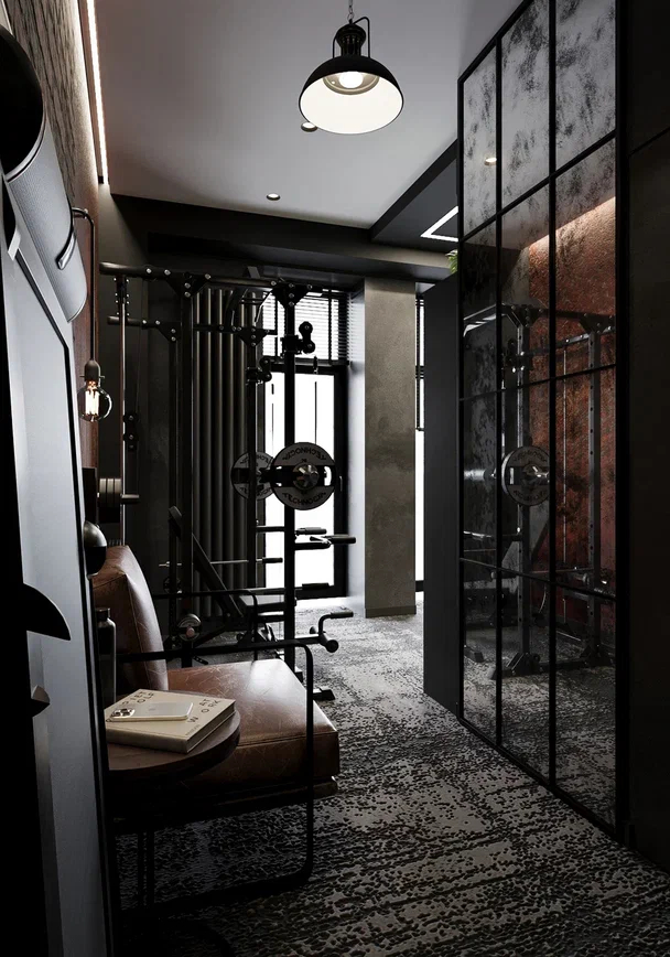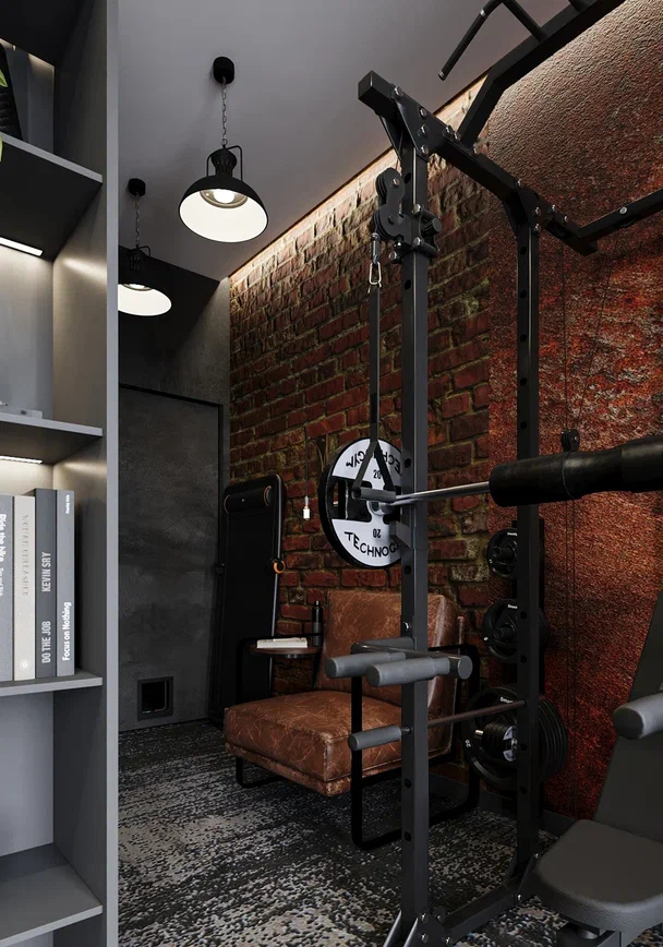 Вторая часть комнаты используется как мини-зал для тренировок. Кирпичная стена с подсветкой усиливает характер помещения. Мягкое кресло и небольшой столик создают уголок для отдыха после работы. Кабинет объединил функциональность и атмосферу силы, став важной частью квартиры.