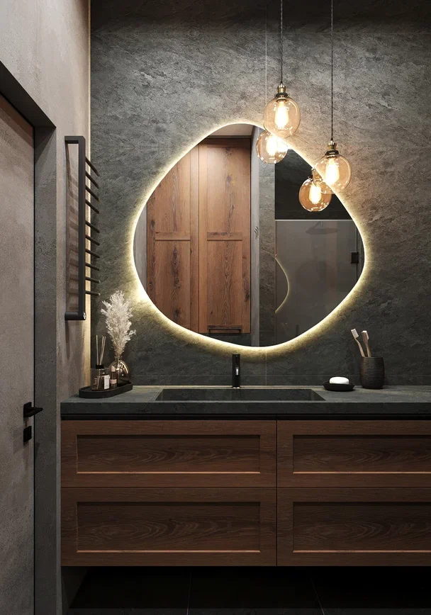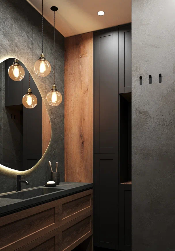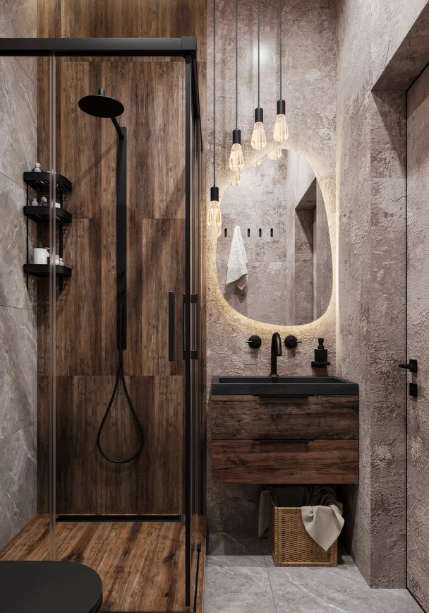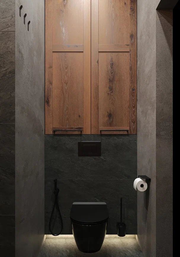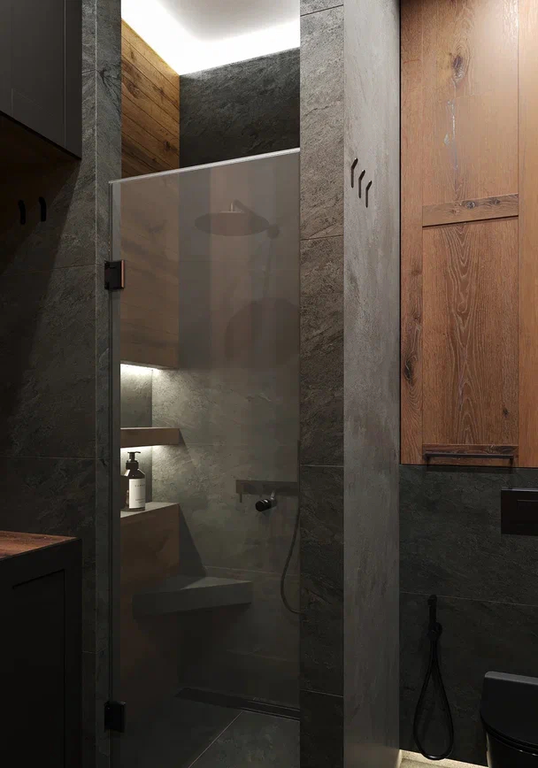 Гостевой санузел оформлен в каменных оттенках с деревянными элементами. В небольшом пространстве предусмотрено всё необходимое — душ, зеркало, раковина и стильная чёрная сантехника. Подсветка добавляет глубину и объём.