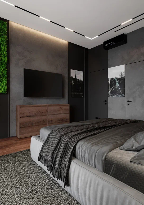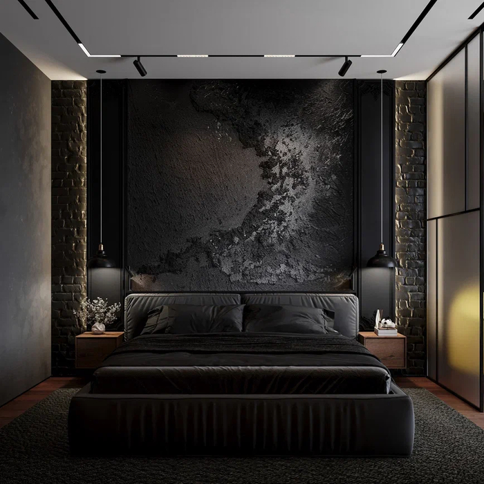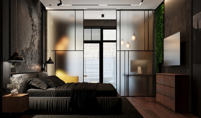 Мастер-спальня выполнена в насыщенных глубоких тонах, где сочетаются кирпич, дерево и мягкие фактурные покрытия. Акцентная стена за кроватью создаёт выразительный визуальный центр. Рабочая зона отделена стеклянной перегородкой с матовыми элементами — она не утяжеляет пространство и сохраняет ощущение света.
